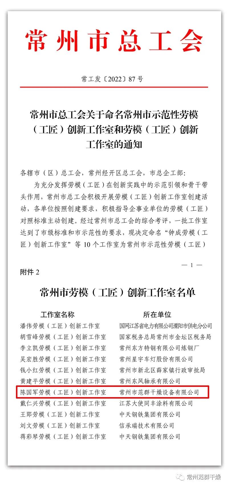 日前,常州市總工會(huì)公布17個(gè)常州市勞模(工匠)創(chuàng)新工作室名單,常州市范群干燥設(shè)備有限公司“陳國(guó)軍勞模(工匠)創(chuàng)新工作室”榜上有名。