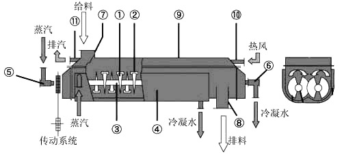 槳葉干燥機是一種以傳導為主的臥式攪拌型干燥機。主體結構為帶有夾套的W型殼體內裝有成對的空心低速回轉中空軸,軸上焊有若干攪拌葉片,夾套和空心攪拌葉片,其內均通以熱載體,兩種加熱面同時對物料加熱。熱載體通常從干燥機中部送入,通過呈攪拌狀態的物料層表面,從另一側排出